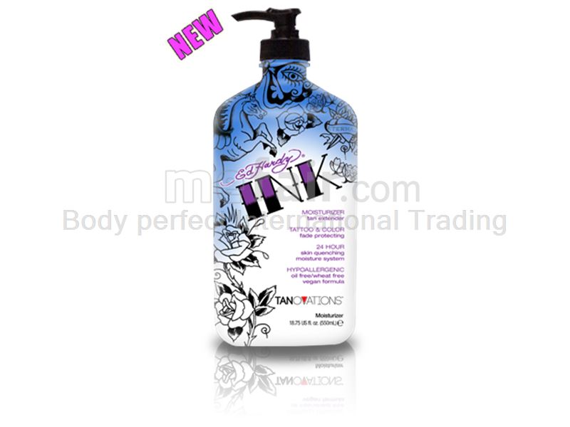 Ed Hardy Tanovations INK MOISTURIZER -18.75 oz. Tattoo & Color Fade Protecting Tan Extender.24-Hour Skin Quenching Moisture System Hypoallergenic – Oil Free – Wheat Free – Vegan Formula Body perfect International Trading www.sdmtan.com